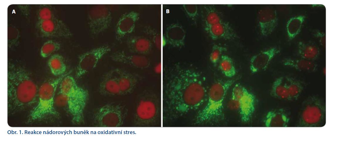 Fluorescenční zobrazení živých buněk maligního melanomu A375 před a po ovlivnění celastrolem, který v buňkách navozuje oxidativní stres. Zeleně je zobrazen mitochondriální protein SSBP1 fúzovaný se zeleným fluorescenčním proteinem EmGFP, červeně je zobrazen transkripční faktor HSF1 fúzovaný s fluorescenčním proteinem mCherry. Na obr. 1A jsou zobrazeny kontrolní buňky před přidáním celastrolu, na obr. 1B buňky vystvené 1 µM celastrolu, 30 min. Vlivem oxidativního stresu dochází k poškození mitochondrií a následné mitofagii. Na snímku obr. 1B je patrné splynutí mitochondrie s lyzozomem. Oxidativní stres rovněž navozuje aktivaci transkripčního faktoru HSF1, která se morfologicky projevuje vytvářením „nuclear stress bodies“ (červené jaderné tečky na snímku obr. 1B) .