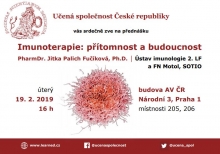 Učená společnost ČR zve členy ČOS na přednášku PharmDr. Jitky Palich Fučíkové, Ph.D. (Ústav imunologie 2. LF a FN Motol, Sotio) s názvem I munoterapie: přítomnost a budoucnost. Přednáška se koná v úterý 19. února 2019 od 16 h v místnostech 205, 206 budovy Akademie věd ČR, Národní 3, Praha 1.