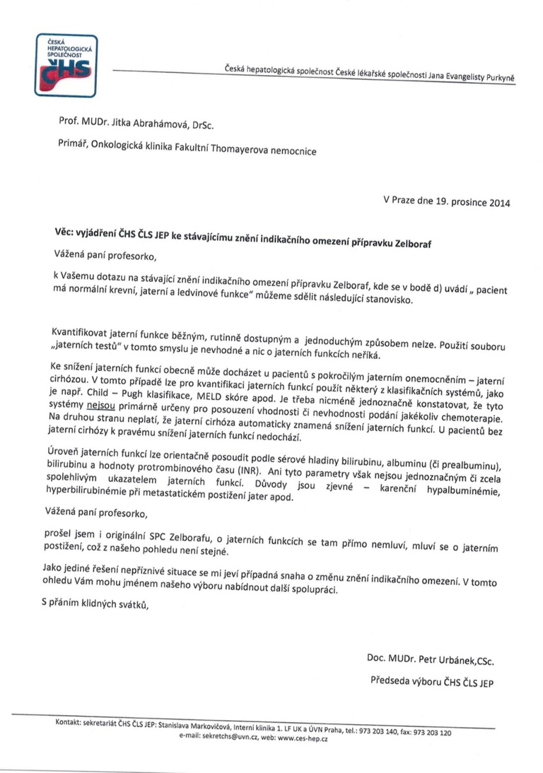 - Vyjádření hepatologické společnosti ke stávajícímu znění indikačního omezení přípravku Zelboraf