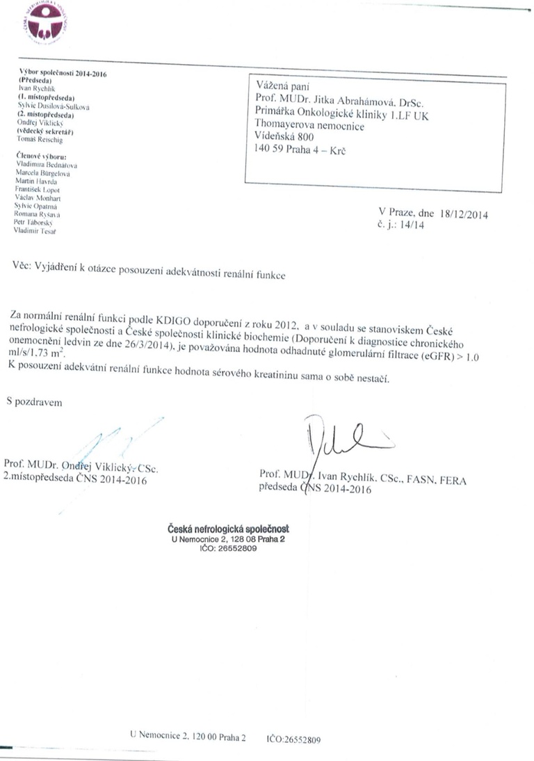 - Vyjádření nefrologické společnosti k otázce posouzení adekvátnosti renální funkce