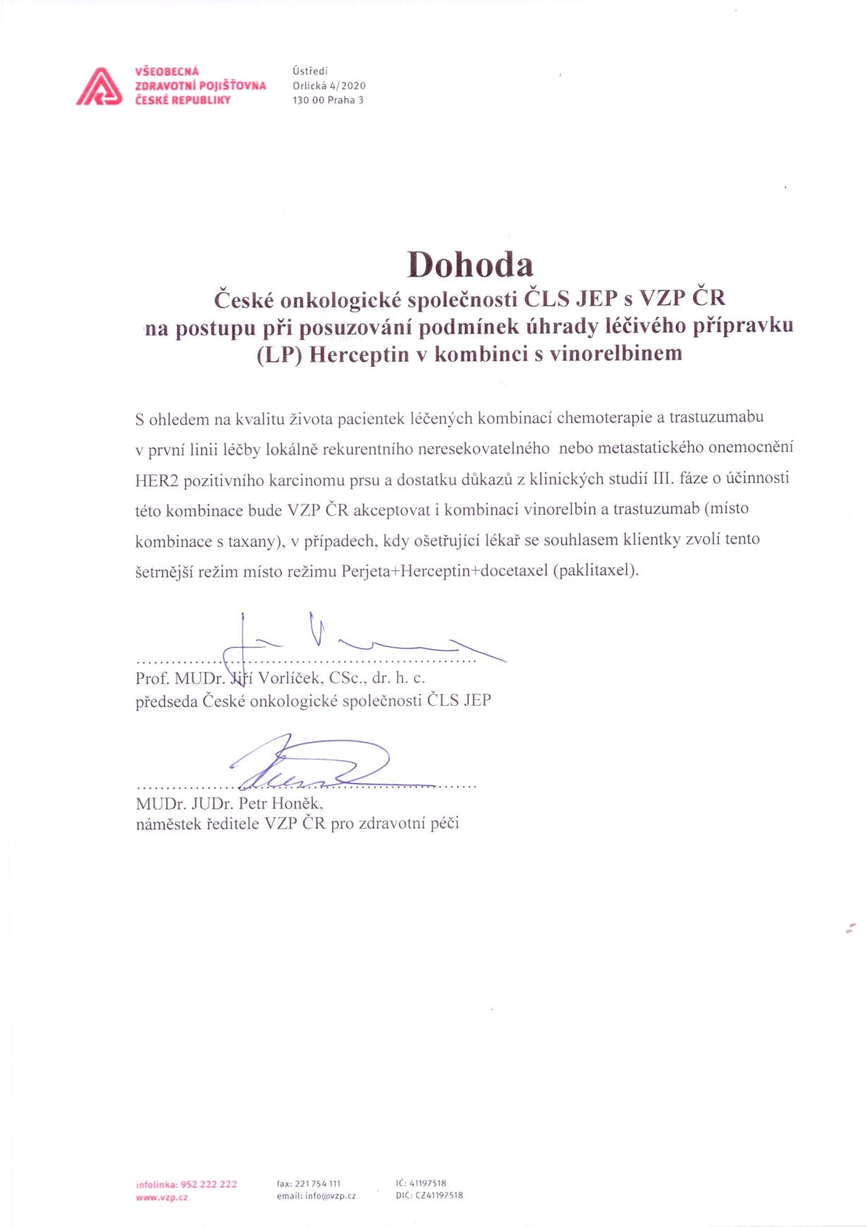 Dohoda ČOS s VZP ČR na postupu při posuzování podmínek úhrady léčivého přípravku Herceptin v kombinaci s vinorelbinem.