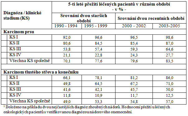 - Prokazatelně se prodlužuje přežití onkologických pacientů u většiny onkologických diagnóz, a to i ve srovnání nedávného období 1995-2000 s roky 2000 – 2006. Z analýz vyplývá, že přežití dosahované v ČR je především u méně pokročilých klinických stadií vysoké a srovnatelné s výsledky vyspělých zemí světa. Šance na dlouhodobější přežití je ovšem výrazně snížena u nejpokročilejšího klinického stadia IV.