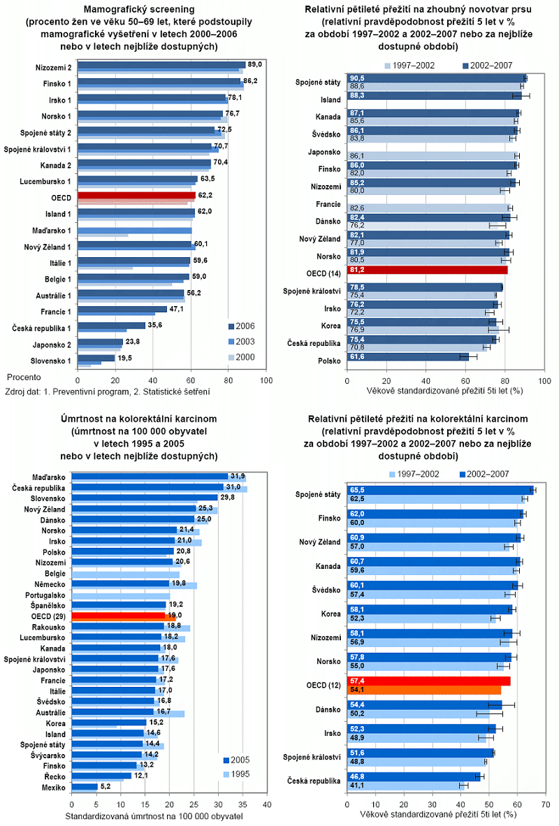 Dlouhodobě patří úmrtnost (mortalita) na zhoubné novotvary v ČR mezi zeměmi OECD k nejvyšším, což je mimo jiné dáno i tím, že patříme mezi onkologicky nejzatíženější populace Evropy. Podle výsledků prezentovaných v publikaci OECD to platí i o relativním pětiletém přežití u vybraných zhoubných novotvarů (nádory prsu, hrdla děložního a kolorektálního karcinomu). Zde se zdá být pozice ČR na první pohled podprůměrná, nicméně z dat je patrné, že se dosahované přežití v ČR za posledních 15 let velmi podstatně zvýšilo u všech tří zkoumaných diagnóz. Toto zlepšení lze dále sledovat i na nejaktuálnějších datech za Českou republiku, které však s ohledem na srovnatelnost s ostatními zeměmi nebyly v publikaci použity.