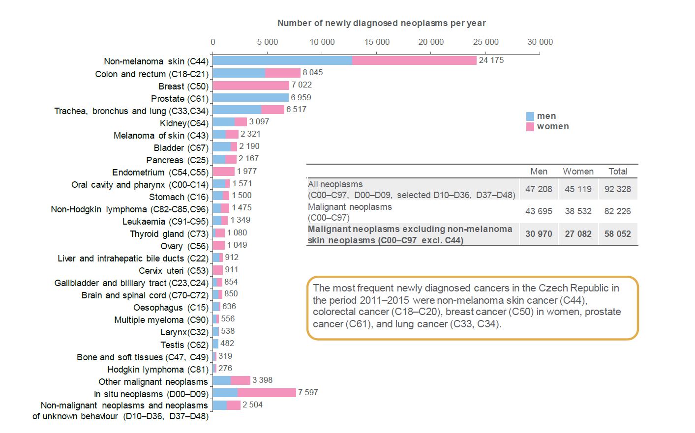 The cancer burden in the Czech population ranks among the highest worldwide and has been growing continuously. Each year in the Czech Republic (with a total population over 10.5 million), over 82,000 people are diagnosed with cancer and over 27,000 patients die from it. Czech men are most frequently affected by prostate cancer, closely followed by colorectal and lung cancer. The most frequent diagnoses in Czech women are breast cancer, followed by colorectal, lung, and uterine cancer. Lung, colorectal, breast, prostate, and pancreatic cancers rank among the most frequent ones with respect to mortality rates.