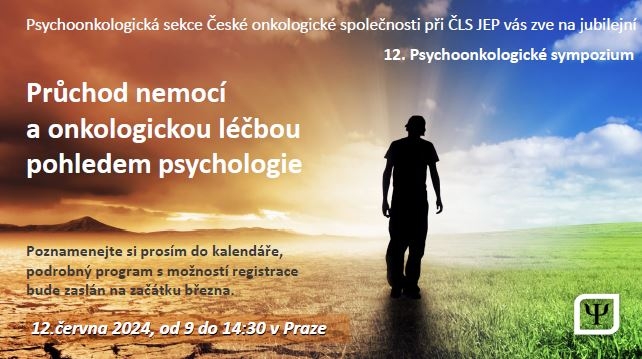 - Přidat do kalendáře: 2024-06-12 09:00:00 2024-06-12 14:30:00 Europe/Prague 12. Psychoonkologické sympozium: Průchod nemocí a onkologickou léčbou pohledem psychologie Psychoonkologická sekce České onkologické společnosti při ČLS JEP vás zve na 12. Psychoonkologické sympozium, tentokrát na téma Průchod nemocí a onkologickou léčbou pohledem psychologie. Velký sál České lékařské společnosti Sokolská 490/31, Praha 2