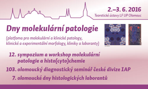 - Přidat do kalendáře: 2016-06-02 00:00:00 2016-06-03 23:59:59 Europe/Prague 12. sympozium a workshop molekulární patologie a histo(cyto)chemie se uskuteční v rámci Dnů molekulární patologie - platformy pro molekulární a klinické patology, klinické a experimentální morfology, kliniky a laboranty. Teoretické ústavy LF UP Olomouc, Hněvotínská 3, Olomouc 779 00