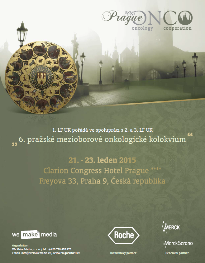 - Přidat do kalendáře: 2015-01-21 00:00:00 2015-01-23 23:59:59 Europe/Prague 6. pražské mezioborové onkologické kolokvium – PragueONCO 2015 6. pražské mezioborové onkologické kolokvium pořádá 1. LF UK ve spolupráci s 2. a 3. LF UK pod heslem Lékaři a sestry společně proti zhoubným nádorům. Clarion Congress Hotel Prague, Freyova 33, Praha 9