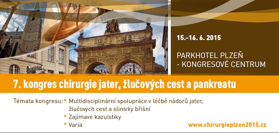 - Přidat do kalendáře: 2015-06-15 00:00:00 2015-06-16 23:59:59 Europe/Prague 7. kongres chirurgie jater, žlučových cest a pankreatu Letos na téma multidisciplinární spolupráce v léčbě nádorů jater, žlučových cest a slinivky břišní. Parkhotel Plzeň - Kongresové centrum, U Borského parku 31, Plzeň