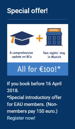 Sekce uroonkologie ČOS Vás upozorňuje na plně interaktivní setkání Update on Bladder Cancer (BCa18), které připravila Evropská urologická společnost (EAU) a Evropská škola urologie (ESU). Setkání je zaměřeno na léčbu zhoubných nádorů močového měchýře. Meeting proběhne pod vedením širokého panelu expertů z řad klinických onkologů a onko-urologů.