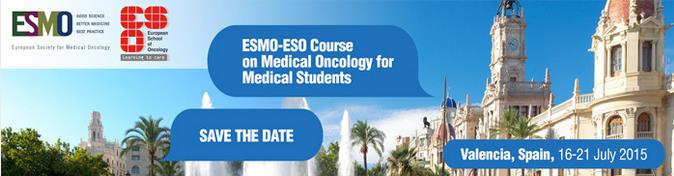 - Přidat do kalendáře: 2015-07-16 00:00:00 2015-07-21 23:59:59 Europe/Prague ESMO-ESO Course on Medical Oncology for Medical Students Hlavní témata kurzu: Breast cancer; Colorectal cancer; Ovarian cancer; Lung cancer; Melanoma; Prostate cancer; Renal carcinoma; Principles of therapies including immunotherapy and targeted agents Určeno pro studenty čtvrtých a pátých ročníků lékařských fakult. Valencia, Spain
