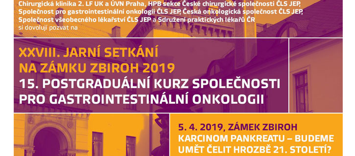 - Přidat do kalendáře: 2019-04-05 00:00:00 2019-04-05 23:59:59 Europe/Prague Karcinom pankreatu-budeme umět čelit hrozbě 21.století? XXVIII. pracovní setkání zámek Zbiroh 2019,15. postgraduální kurz společnosti pro gastrointestinální onkologii XXVII. Jarní pracovní setkání na zámku Zbiroh, pořádá Chirurgická klinika 2.LF UK a ÚVN Praha, HPB sekce České chirurgické společnosti ČLS JEP, Společnost pro gastrointestinální onkologii ČLS JEP, Česká onkologická společnost ČLS JEP, Společnost všeobecného lékařství ČLS JEP a Sdružení praktických lékařů ČR. Vzhledem k pozitivním reakcím z loňského roku, organizátoři i letos jarní setkání ponechali v krásných prostorách zámku Zbiroh, pokračuje se tedy v tradiční atmosféře i duchu jednání, tak jak znáte z Lokte. Muchův sál, zámek Zbiroh