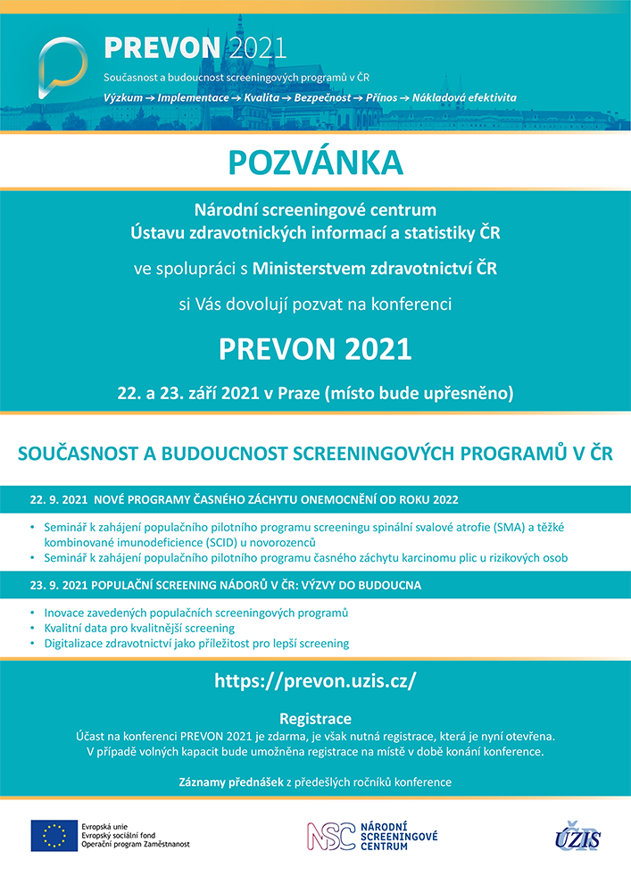 - Přidat do kalendáře: 2021-09-22 00:00:00 2021-09-23 23:59:59 Europe/Prague konference PREVON 2021 Ve dnech 22. až 23. září 2021 se bude konat již čtvrtý ročník konference PREVON, která bude zaměřena na současnost a budoucnost screeningových programů v České republice. Čtvrtý ročník konference PREVON byl již připravován v roce 2020, nicméně se z důvodů sílící epidemie onemocnění COVID-19 neuskutečnil. Zaměření tohoto ročníku konference jsme ponechali totožné, protože témata aktuálního systému screeningů a dopadů pandemie, a hlavně budoucnost screeningových programů nabývají na důležitosti. Praha