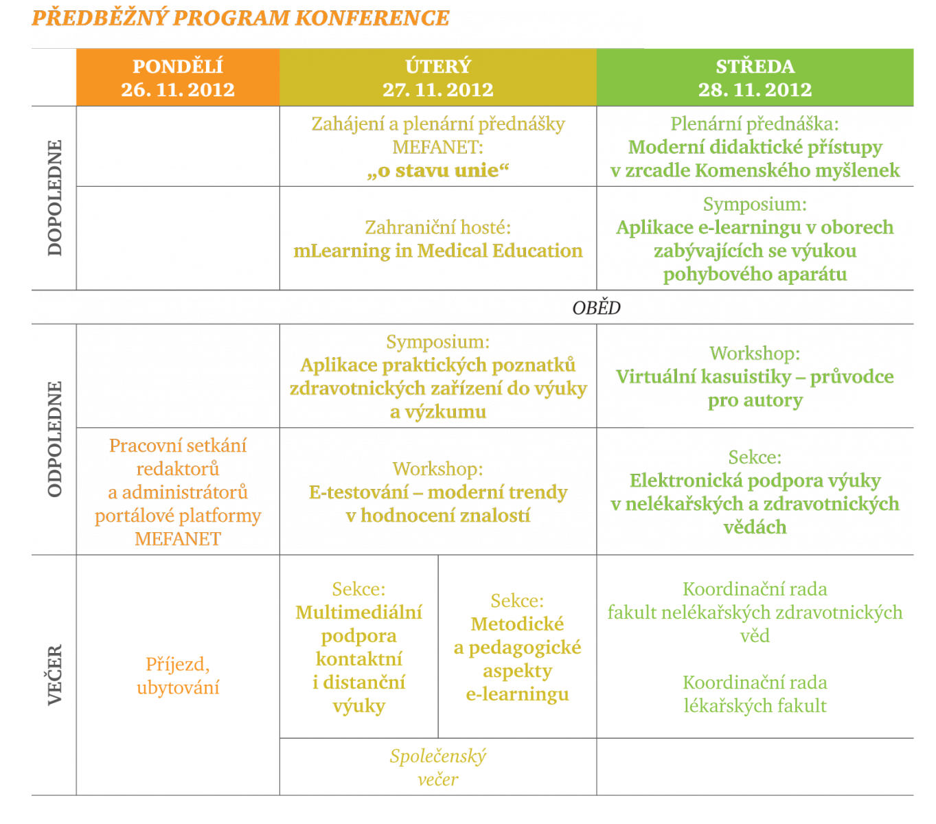 - Vedle obecných aspektů e-learningu se bude konference zabývat i dopadem tohoto fenoménu na konkrétní obor medicíny. Pro šestý ročník bylo zvoleno téma: Pohybový systém (anatomie, ortopedie, funkční vyšetření, traumatologie, …)