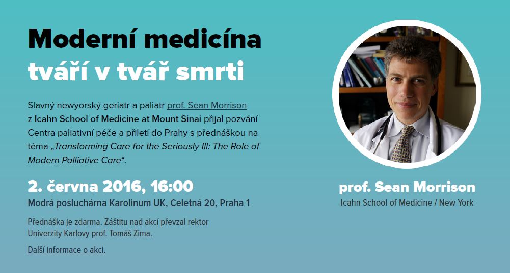 - Přidat do kalendáře: 2016-06-02 16:00:00 2016-06-02 23:59:59 Europe/Prague Moderní medicína tváří v tvář smrti Zveme vás na přednášku slavného geriatra a paliatra prof. Seana Morrisona z Icahn School of Medicine v New Yorku. Modrá posluchárna Karolinum UK, Celetná 20, Praha 1
