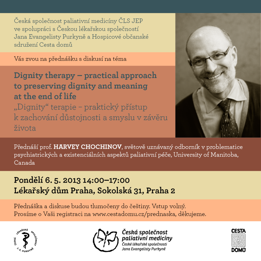 - Přidat do kalendáře: 2013-05-06 14:00:00 2013-05-06 17:00:00 Europe/Prague Praktický přístup k udržení důstojnosti a smyslu v závěru života 6.5.2013 se v Praze uskuteční přednáška a workshop s prof. H.Chochinovem z Kanady, předním světovým odborníkem na psychiatrické a existenciální aspekty paliativní péče. Lékařský dům Praha, Sokolská 31, Praha 2