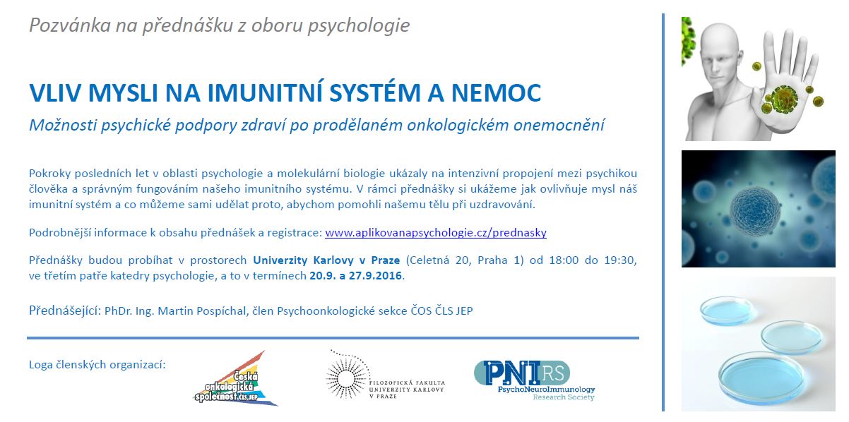- Přidat do kalendáře: 2016-09-20 18:00:00 2016-09-20 19:30:00 Europe/Prague Vliv mysli na imunitní systém a nemoc Možnosti psychické podpory zdraví po prodělaném onkologickém onemocnění. Psychoonkologická sekce ČOS zve odborníky i laiky na přednášku z oboru psychologie. Univerzita Karlova v Praze, 3. patro Katedra psychologie Celetná 20, Praha 1
