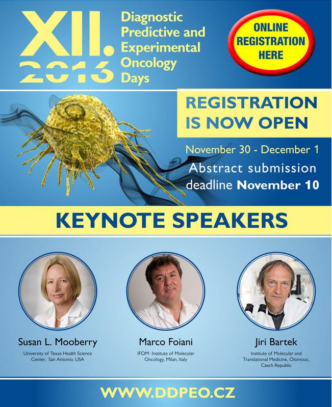 - Přidat do kalendáře: 2016-11-30 00:00:00 2016-12-01 23:59:59 Europe/Prague XII. Dny diagnostické prediktivní a experimentalni onkologie Konference vytváří interdisciplinární platformu pro spolupráci odborníků z řady teoretických, preklinických a klinických oborů zabývajících se diagnostikou a léčbou maligních nádorů. Olomouc