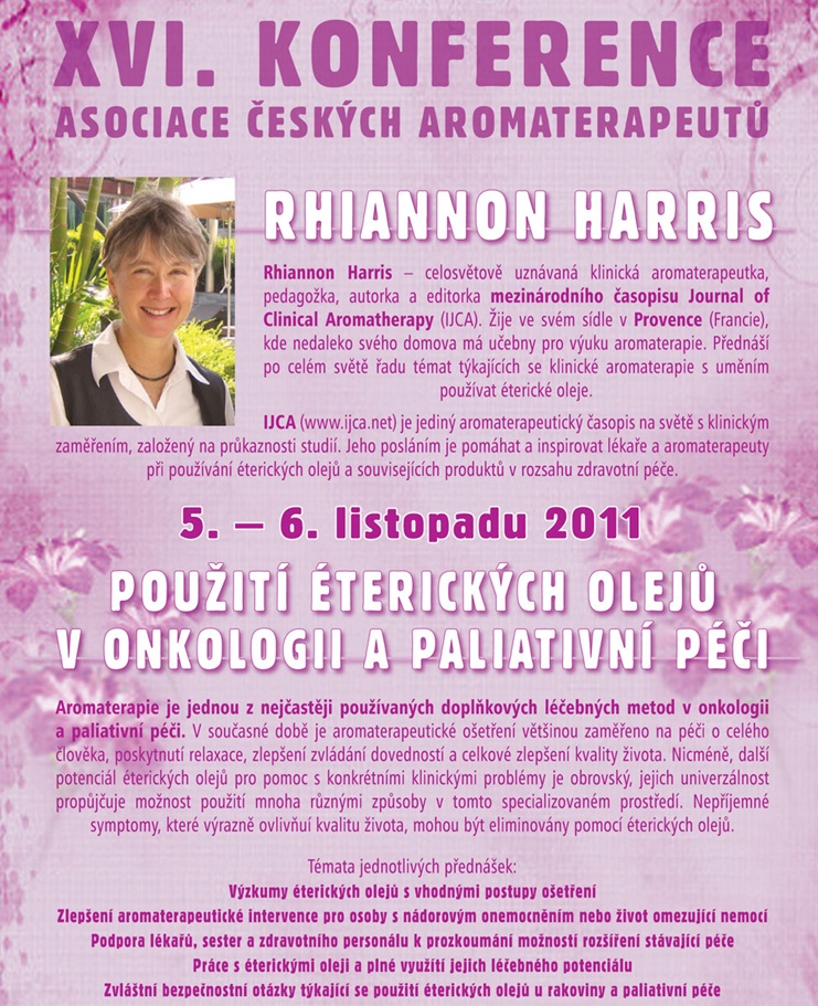 - Přidat do kalendáře: 2011-11-05 00:00:00 2011-11-06 23:59:59 Europe/Prague XVI. Konference Asociace českých aromaterapeutů - použití éterických olejů v onkologii a paliativní péči Rhiannon Harris – celosvětově uznávaná klinická aromaterapeutka, pedagožka, autorka a editorka mezinárodního časopisu Journal of Clinical Aromatherapy (IJCA). Aromaterapie je jednou z nejčastěji používaných doplňkových léčebných metod v onkologii a paliativní péči. V současné době je aromaterapeutické ošetření většinou zaměřeno na péči o celého člověka, poskytnutí relaxace, zlepšení zvládání dovedností a celkové zlepšení kvality života. Nicméně, další potenciál éterických olejů přicházející pro pomoc s konkrétními klinickými problémy je obrovský, jejich univerzálnost propůjčuje možnost použití mnoha různými způsoby v tomto specializovaném prostředí. Nepříjemné symptomy, výrazně ovlivňující kvalitu života, mohou být eliminovány pomocí éterických olejů. Hotel POPULUS, U Staré Cihelny 2182/11, Praha 3