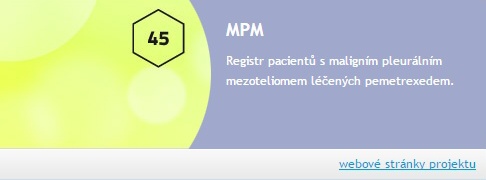 Projekt registru PemetrexedProjekt je klinický registr zaměřený na sběr dat pacientů s nemalobuněčným karcinomem plic nebo maligním pleurálním mezoteliomem, kteří jsou léčeni přípravkem pemetrexedem. Odbornými garanty projektu jsou Česká onkologická společnost ČLS JEP a Česká pneumologická a ftizeologická společnost ČLS JEP. Cílem projektu Pemetrexed je sledování bezpečnosti a efektivity léčby tímto přípravkem, což umožňuje analýzu epidemiologických charakteristik onkologických pacientů a jejich odpovědí na léčbu, modelování vlivu rizikových faktorů na přežití a detailní rozbor nežádoucích účinků. Projekt Pemetrexed je také zařazen v rámci Národního onkologického programu mezi projekty hodnocení a monitoringu výsledků a kvality péče, kde se bude svými výsledky podílet na zlepšení kvality života pacientů s karcinomem plic a mezoteliomem a na racionalizaci nákladů na jejich léčbu. VSTUP DO REGISTRU |