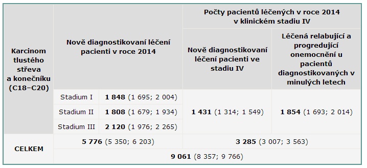 Souhrnný odhad počtu pacientů s karcinomem tlustého střeva a konečníku potenciálně léčených v roce 2014: