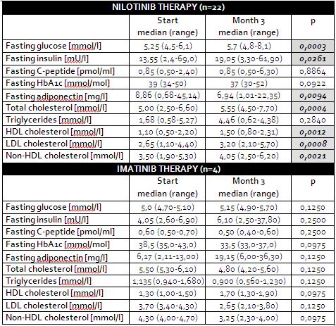 Methods: Patients received intensive laboratory workup before the start of TKI and after 3 month of therapy. This included fasting insulin, glucose, adiponectin and lipid serum concentration, HbA1c and oral glucose tolerance test.