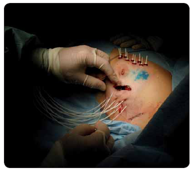 Perioperační MIB pro APBI je používána na naší klinice od roku 2012 pro vybrané pacientky s karcinomem prsu s nízkým rizikem (věk > 60 let, pT1pN0M0, G1–G2, bez angioa lymfangioinvaze, HER2 neg). U těchto pacientek jsou bezprostředně po tumorektomii s biopsií sentinelové uzliny a zavedení chirurgických svorek aplikovány afterloadingové plastické katetry pomocí dutých ocelových jehel. APBI je zahájena 7. pooperační den. Po zakreslení lůžka tumoru s ohledem na jizvu, chirurgické svorky a lokalizaci tumoru dle mamografie je definován CTV tak, aby zaručoval bezpečnostní lem minimálně 20 mm ve všech směrech. Předepsaná dávka je 34 Gy (10 × 3,4 Gy 2krát denně).