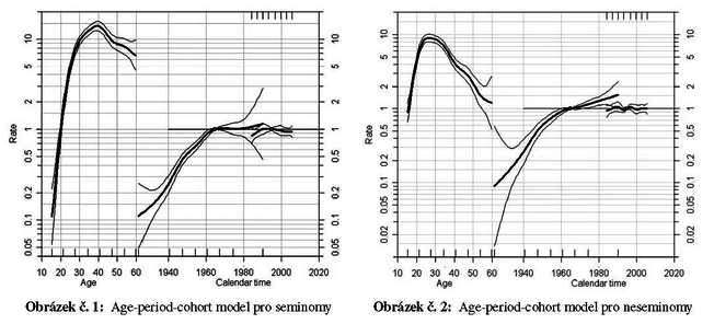 Na obrázcích 1,2 jsou graficky znázorněny odhady vlivu věku při diagnóze, roku diagnózy a roku narození. Muži narození v letech 1966 až 1980 mají stejné riziko onemocnění seminomy jako muži v referenční kohortě 1965. 95% konfidenční interval pro poměr měr (rate ratio) obsahuje hodnotu 1, proto usuzujeme, že u této skupiny mužů nedochází k nárůstu rizika onemocnění. Na rozdíl od seminomu pozorujeme u neseminomu rostoucí riziko tohoto onemocnění. Dolní mez 95% intervalu spolehlivosti je nad hodnotou 1.