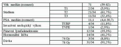 Akutní toxicitu jsme hodnotili pouze u pacientů, kteří byli léčeni dávkou vyšší než 70 Gy. Druhou podmínkou pro zařazení do analýzy byla minimální doba sledování 3 měsíce od ukončení radioterapie. Soubor hodnocených pacientů zahrnoval 34 mužů (Tab. 1). Medián doby sledování je 6,1 měsíce (rozmezí 3,0-18,1 měsíce).