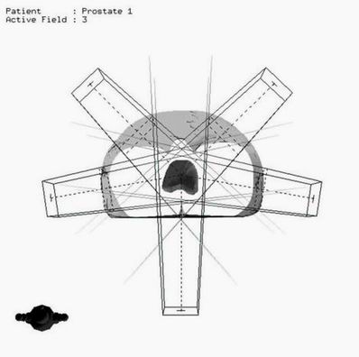 Obr. 1 IMRT technika pěti polí při ozařování oblasti prostaty.