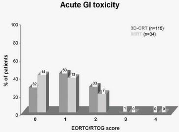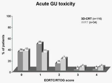 Zelefsky a spol. léčili pomocí IMRT 698 pacientů s karcinomem prostaty dávkou 81,0-86,4 Gy. Akutní gastrointestinální (GI) toxicitu 2. stupně zaznamenali u 4,5 % pacientů. Známky akutní genitourinární (GU toxicity 2. a 3. stupně mělo 28 %, respektive 0,1 % pacientů. De Meerleer a spol. referovali o akutní toxicitě u 114 pacientů, kteří podstoupili IMRT pro karcinom prostaty. Medián dávky v cílovém objemu byl 74-78 Gy. Akutní GI toxicita 2. stupně byla pozorována u 27 % pacientů. Akutní GU toxicitou 3. stupně trpělo 7 % pacientů.