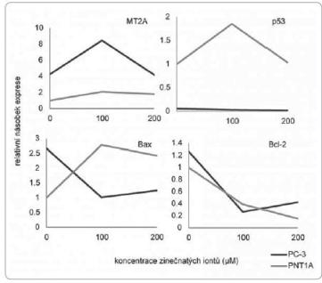 Obr. 1. Tyto grafy znázorňují relativní expresi významných genů u buněčných linií PC-3 a PNT1A. Jako kontrola byla použita exprese těchtogenů u linie PNT1A pěstované v nulové koncentraci zinečnatých iontů. Na obrázku jsou patrné rozdílné trendy u obou linií v expresi genu pro Bax a naopak shodné reakce na treatment v expresi genu Bcl-2. Gen pro p53 byl významně ovlivněn pouze u linie PNT1A, zatímco rozdílnou expresí genu MT2A reagovala více linie PC-3.
