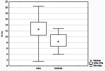 V souboru onkologických pacientů bylo hodnoceno 17 vzorků. Koncentrace metalothioneinu v plné krvi nabývaly průměrné hodnoty 12,58±4,22 µl/ml. V kontrolním souboru 12 zdravých jedinců byla průměrná koncentrace 8,52±2,90 µl/ml.