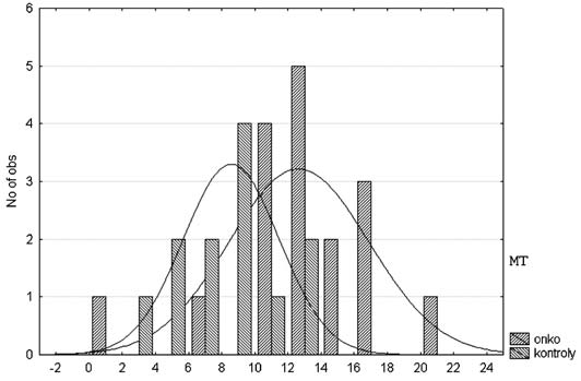Při vzájemném porovnání byly hladiny MT u onkologických pacientů významně vyšší než u kontrolní skupiny (p=0,003). Vyšší koncentraci MT jsme naměřili u pacientů s lokoregionální metastatickou diseminací do krčních uzlin ve srovnání s tumory bez uzlinového postižení. Zatím, pravděpodobně vzhledem k malému počtu pacientů, nebyl tento předpoklad potvrzen na statisticky významné hladině.