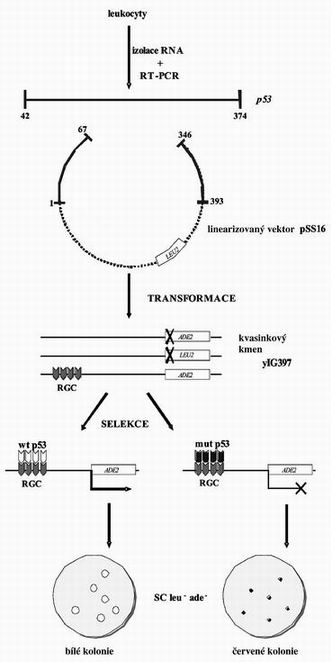 Schéma metody FASAY. Z vyšetřovaného materiálu je izolována RNA a pomocí metody RT-PCR je amplifikována část genu p53, mezi kodóny 42 a 374. Kvasinkové buňky yIG397 jsou transformovány produktem PCR spolu s otevřeným expresním vektorem pSS16, který nese konce genu p53, a selekční marker LEU2,. Kvasinkový kmen yIG397 je leu-adea obsahuje reportérský gen ADE2, s předřazeným minimálním promotorem a vazebným místem pro p53. Buňky transformované plasmidem, který nese funkční p53, exprimují gen ADE2 a tvoří na selekčním mediu bílé kolonie. Buňky obsahující mutovaný protein p53 neexprimují gen ADE2, a tvoří na selekčním mediu menší červené kolonie v důsledku akumulace červeného meziproduktu syntézy adeninu.