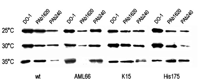 Sledování teplotní závislosti konformačního stavu proteinů p53 v kvasinkách. Z kvasinkových buněk exprimujících analyzované varianty p53 a kultivovaných ve vyznačených teplotách byly připraveny proteinové lyzáty. Z nich byl pomocí specifické protilátky imunoprecipitován protein p53. K imunoprecipitaci byly použity kontrolní protilátka DO-1, která rozpoznává protein p53 nezávisle na jeho konformačním stavu, protilátka PAb1620, která specificky rozpoznává nativní konformaci, a protilátka PAb240, která rozpoznává mutantní konformaci p53. Uvedeny jsou kontrolní varianty p53: funkční protein p53 (wt), plně inaktivní mutant (His175) a dva příklady teplotně závislých mutantů p53: , ts mutanta E286K (AML66) a cs, mutanta P98A (K15).