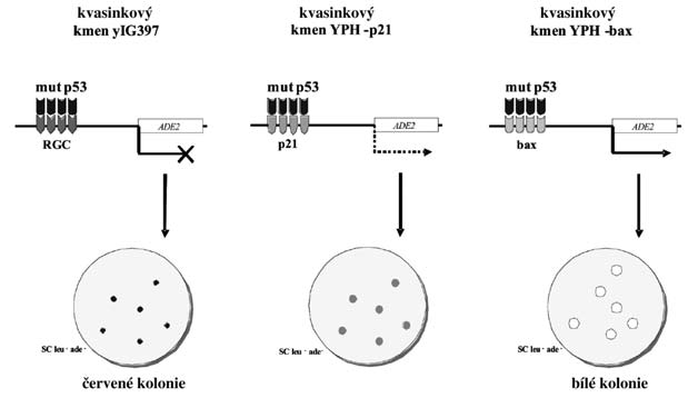 Testovali jsme transaktivační schopnosti teplotně závislých mutantů p53 v kvasinkových buňkách, kde reportérskému genu ADE2, byly předřazeny sekvence z promotorů genů bax, p21 a RGC , (obr. 2).