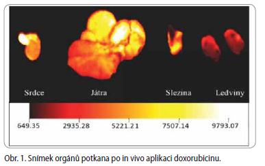 DOXO vykazuje silnou fluorescenci, což lze pozorovat na obr. 1 nejvíce u srdce, jater a částečně slezíny. Ledviny vykazovaly fluorescenci nižší. Výsledky HPLC analýzy srdečního extraktu vykazovaly značný rozdíl mezi píkem samotného DOXO a píkem srdce potkana po aplikaci DOXO. Pozorovali jsme signifikantní snížení koncentrace doxorubicinu, a to přibližně o 80 °%, což lze přisoudit změně redoxního stavu DOXO.