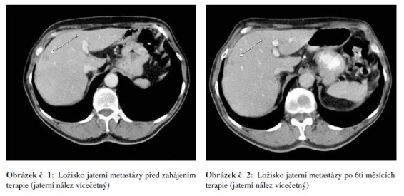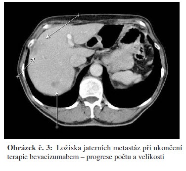Po korekci hypertenze v říjnu 2008 zahájena chemoterapie FOLFOX 4 + bevacizumab. Kontrolní restaging po 6.s. chemoterapie v lednu a únoru 2009 ukázal parciální regresi jaterního postižení s normalizací hodnot CEA. Postižení nadále nevhodné pro chirurgické řešení a RFA. Pacient nadále bez proteinurie, hypertenze na monoterapii ACEI a stále přiměřená hematologická tolerance. Největší obtíží pacienta bylo ošetřování stomie při diarhoe dobře reagující na terapii loperamidem (Imodium®) nebo diphenoxylatem s atropinem (Reasec®). Jednou podán pouze bevacizumab pro nežádoucí účinky chemoterapie – průjmy. Vzhledem k výbornému stavu pacienta rozhodnuto pokračovat v další chemoterapii. Po dalších 3 měsících v květnu 2009 proveden restaging se stabilizací CT nálezu jaterních metastáz a trvající regresí CEA. Pacient nadále bez výraznějších toxicit, hypertenze nadále na monoterapii ACEI, bez proteinurie, hematologická tolerance přiměřená a diarhoe reagující na Reasec (diarhoe hodnotíme jako nežádoucí účinek flurouracilu). Vzhledem k dobrému stavu pacienta PS 1 opět rozhodnuto pokračovat v další chemoterapii. Po dalších 3 měsících restaging s trvající parciální regresí a nadále pokračováno v chemoterapii. V září 2009 pro vyčerpání pacienta při PS 2 pokračováno dále v monoterapii bevacizumabem. V říjnu 2009 na kontrolním CT hrudníku, břicha a pánve progrese onemocnění, dále progrese CEA a terapie bevacizumabem ukončena. Celkem podáno 20 serií Avastinu v režimu à 14 dnů (v kombinaci s FOLFOX 4 nebo samostatně).