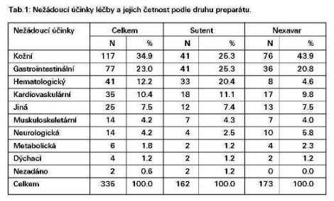 Alespoň jeden nežádoucí účinek (NÚ) byl zaznamenán u 193 (55%) nemocných a celkem bylo zaznamenáno 335 NÚ. Specifikaci NÚ a jejich četnost podle druhu preparátu zobrazuje tabulka 1.