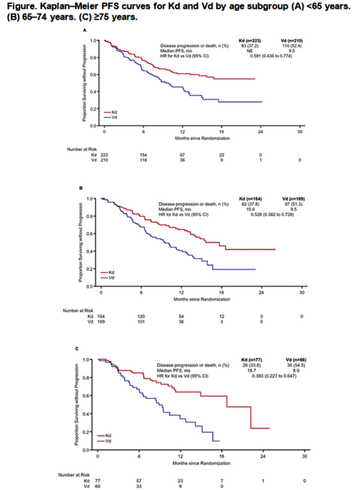 Results:A total of 929 patients were enrolled (intent-to-treat population; <65 years: Kd, n=223; Vd, n=210; 65–74 years: Kd, n=164; Vd, n=189; ≥75 years: Kd, n=77; Vd, n=66). Baseline patient and disease characteristics were generally well balanced between treatment arms within each age subgroup. PFS was improved with Kd vs Vd within each age subgroup (<65 years: median, not estimable vs 9.5 months [HR, 0.58; 95% CI, 0.44–0.77]; 65–74 years: median, 15.6 months vs 9.5 months [HR, 0.53; 95% CI, 0.38–0.73]; ≥75 years: median, 18.7 months vs 8.9 months [HR, 0.38; 95% CI, 0.23–0.65]) (Table). Kaplan–Meier PFS curves by age subgroup are shown in the Figure. ORRs in each age group were also higher in the Kd arm compared with the Vd arm in each subgroup (<65 years: 74% vs 61% [odds ratio, 1.82; 95% CI, 1.21–2.74]; 65–74 years: 77% vs 66% [odds ratio, 1.80; 95% CI, 1.12–2.89]; ≥75 years: 84% vs 59% [odds ratio, 3.75; 95% CI, 1.71–8.24]). Rates of grade ≥3 adverse events of interest, including hypertension are shown in the Table. Grade ≥3 hypertension, dyspnea, cardiac failure, renal failure were more common with Kd vs Vd within each age subgroup. Rates of grade ≥2 PN were lower in the Kd arm across all subgroups compared with the Vd arm (<65 years: 6% vs 27% [odds ratio, 0.17; 95% CI, 0.09–0.32]; 65–74 years: 8% vs 34% [odds ratio, 0.17; 95% CI, 0.09–0.32]; ≥75 years: 3% vs 43% [odds ratio, 0.035; 95% CI, 0.008–0.16]). Adverse events leading to treatment discontinuation occurred at similar frequencies in the Kd and Vd arms in the two younger-age subgroups (<65 years: 17% vs 15%; 65–74 years: 22% vs 22%), but at a higher frequency in the Vd arm for the oldest-age subgroup (≥75 years: 26% vs 35%). Deaths within 30 days post-treatment due to adverse events occurred at similar rates in the Kd and Vd arms within each age subgroup (<65 years: 3% vs 3%; 65–74 years: 5% vs 3%; ≥75 years: 4% vs 5%).