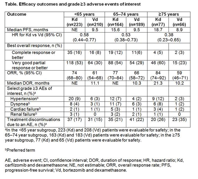 Methods: Adult patients with relapsed multiple myeloma (RMM; 1–3 prior regimens) were eligible. Patients in the Kd arm received K (30-min intravenous [IV] infusion) on days (D) 1, 2, 8, 9, 15, and 16 (20 mg/m2 on D1, 2 [cycle 1]; 56 mg/m2 thereafter) and dexamethasone (20 mg) on D1, 2, 8, 9, 15, 16, 22, and 23 of 28-day cycles. The Vd arm received V (1.3 mg/m2; IV or subcutaneously) on D1, 4, 8, and 11 and dexamethasone (20 mg) on D1, 2, 4, 5, 8, 9, 11, and 12 of 21-day cycles. Treatment was administered until disease progression or unacceptable toxicity. The primary end point of the study was PFS; secondary end points included overall survival, overall response rate (ORR), duration of response (DOR), safety, and rate of peripheral neuropathy (PN). The present analyses evaluated outcomes in patients grouped according to age (ie, <65, 65–74, and ≥75 years of age).