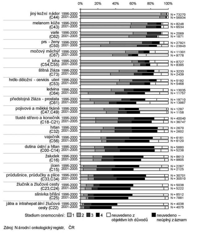 Obrázek 1. Zastoupení klinických stadií zhoubných novotvarů (data NOR za období 1996–2000 a 2001–2005;řazeno dle podílu stadií 1 a 2)