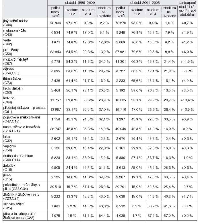 Tabulka 1. Zastoupeni časných klinických stadií u zhoubných novotvarů (data NOR za období 1996–2000 a 2001–2005).