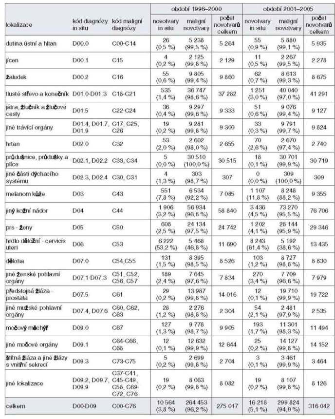 Tabulka 2. Novotvary in situ a maligní novotvary v různých lokalizacích (data NOR za období 1996–2000 a 2001–2005).