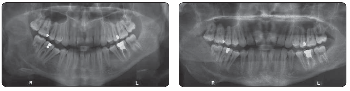 Na naše oddělení byl odeslán 15letý chlapec s postupně narůstající asymetrií obličeje v oblasti pravého úhlu dolní čelisti. OPG a CT vyšetření odhalilo deformaci čelisti, resorpci kortikalis a kořenů přilehlých zubů. Pomocí histologického vyšetření byla stanovena diagnóza CGCG s klinicky agresivním chováním. Chirurgická terapie by znamenala resekci značné části dolní čelisti s deformací obličeje mladého pacienta. Proto jsme se rozhodli pro konzervativní postup a v celkové anestezii, po perforaci kotikalis na několika místech, celkem 6krát aplikovali ve dvou týdenních intervalech směs triamcinolonu (20 mg/ ml) a Supracainu 4% v poměru 1 : 1. Již po třech měsících bylo patrné zmenšení asymetrie obličeje a na kontrolním OPG a CT po 6 měsících výrazná regrese ložiska s novotvorbou kosti. Pacient je nadále sledován a předpokládá se úplné vyhojení tumoru.