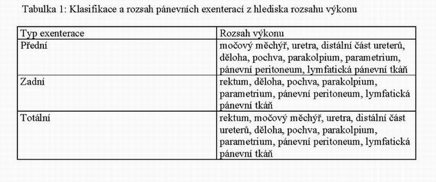 Z hlediska rozsahu lze výkon rozdělit na přední, zadní a totální exenteraci, každý z těchto typů lze provádět v rozsahu supra- či infralevatorickém (tabulka 1). Supralevatorická exenterace je indikována u tumorů lokalizovaných nad úrovní mm. levatores ani. Při výkonu jsou zachovány svaly dna pánevního, distální část rekta se svěračem, distální 1/3 pochvy, uretra a část krčku močového měchýře. Rozsah infralevatorické exenterace neumožňuje ponechat žádný z výše jmenovaných orgánů. Zvolení rozsahu výkonu musí na prvním místě