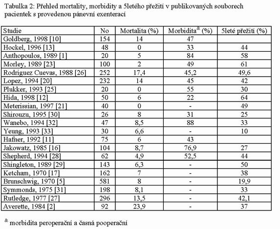 Tabulka 2: Přehled mortality, morbidity a 5letého přežití v publikovaných souborech pacientek s provedenou pánevní exenterací