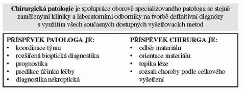 V přednášce byla nastíněna problematika u nás stále ještě nového či nově chápaného medicínského oboru, vycházejícího z týmové spolupráce patologů, kliniků a laboratorních specialistů – chirurgické patologie. V retrospektivním ohlédnutí jsme připomněli praktické začátky klinicko-patologické spolupráce s některými jejich dosud platnými závěry. Pro výhled uplatnění oboru jsme uvedli základní algoritmus úvodního zpracování tkáňového vzorku odebírajícím klinikem a bezprostředně na něj navazujícím patologem.