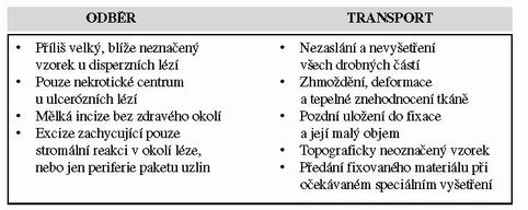 Na tomto místě zopakujeme hlavní zásady společné práce, jejichž uplatnění je nutné i v současnosti a to nejen na relativně malém pracovišti, ale i na velkých ústavech a klinikách. V první řadě nejčastější chyby při odběru a transportu odň atých tkání a dále zásady nutné pro práci v oblasti peroperační biopsie. Oboje je zpracováno tabelárně.