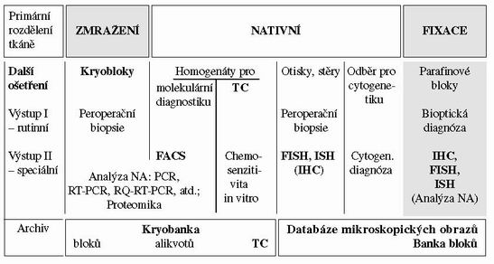 Vysvětlení podstaty genetické informace a jejího přepisu do proteinů postupně zásadním způsobem změnilo pohled na patogenezi celé řady nemocí a vedlo i k novému pojetí řady nosologických jednotek. Diagnostikující patolog tak již nevystačí s pouhými mikroskopickými technikami, ale musí svoji metodickou paletu rozšířit o postupy dosud používané v biologii a genetice – o tzv. molekulární diagnostiku. Touto se v současnosti většinou rozumí diagnostika na úrovni nosologicky specifických změn DNK a RNK. Významně se současně rozšířilo i poznání v oblasti diagnostiky na úrovni strukturálních i regulačních proteinů a jejich vztahů v buňce – proteomika. Pro kompletní diagnostický závěr je dnes v řadě případů, a zejména v onkologii, potřebné komplexní vyšetření postižených tkání na lince DNK, RNK, protein s analýzou poruch genomu, transkripce i translace. Kromě nutnosti zavedení týmové spolupráce s obory dosud v medicíně ne zcela zdomácnělými vzniká i potřeba nového způsobu nakládání s excidovanými tkáněmi a jejich takřka rutinní skladování v několika typech tkáň ových bank pro zachování možnosti pozdějšího vyšetření a eventuelně pro využití ve výzkumu. Chirurgický patolog má velmi dobré předpoklady pro organizaci práce celého týmu a pro kvalifikovaný banking. Základním předpokladem je jeho klasická úloha ve zpracování tkání a jejich výběru podle předběžného mikroskopického vyšetření. Současně většinou ovládá svou úvodní diagnózou i první indikaci spektra návazných speciálních metod, které nelze – vzhledem k nákladnosti – indikovat paušálně. V časovém prostoru přednášky považujeme za prospěšné, z celé rozsáhlé problematiky, podat alespoň základní přehled o současném pohledu na úvodní zpracování odebraného tkáň ového vzorku chirurgickým patologem. Doufáme, že seznámení se s tímto algoritmem je užitečné nejen pro patologa, ale i pro všechny kliniky podílející se na diagnóze a léčení dárce tkáně a výzkumné pracovníky používající „zbytkový“ materiál.
